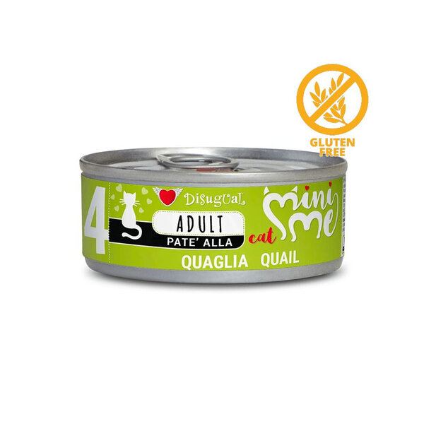 Disugual MiniMe Cat е пълноценна богата на пъдпъдъче храна за отраснали котки от всички породи и възрасти.Пастета е приготвен с 96% месо годно за човешка употреба.• Без ГМО;• Без изкуствени консерванти, оцветители или подобрители на вкуса;• Без глутен.