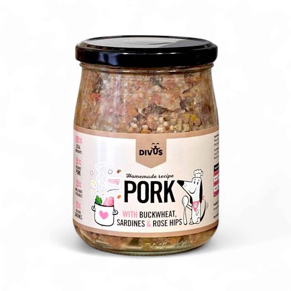 Апетитна комбинация с висока хранителна стойност –свинско месо за енергия, сардини с Омега-3 за здрава козина и шипка за силен имунитет.Лесно смилаемо меню, подходящо и за чувствителни кучета.