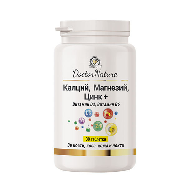 Калцият е един от най-изобилстващите минерали в човешкото тяло, като костите и зъбите на човек съдържат 99% от общото количество калций в организма. Калцият е отговорен за здравината на зъбите и костите, провеждането на нервните импулси, активиране на някои ензими, кръвосъсирване, мускулна контракция, транспорт на йони през клетъчни мембрани, регулиране на сърдечната дейност и др. Оптималното количество калций в комбинация с витамин D3 спомага за нормална костна плътност и намалява развитието на остеопороза. Магнезият също е един от най-разпространените елементи в организма. Той се среща във всички клетки, като допринася за нормална фукция на мускулите и нервната система. Освен това, приемът на магнезий намалява стреса и тревожността и подобрява съня. Цънкът е изключително необходим на организма за изграждане на здрава имунна система. По този начин допринася за устойчивост към заболявания, както и за по-бързо възстановяване. Витамин Д стимулира усвояването на калций от костите, като осигурява здравина и стабилност на костните структури и зъбите. Витамин B6 има отношение към абсорбцията на калций в организма, като има положително влияние върху нервната система и стреса. Начин на употреба: 1 таблетка дневно, след хранене