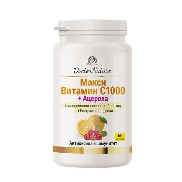 Dr. Nature Макси Витамин С 1000 + Ацерола съдържа високи дози витамин С плюс натурален екстракт от ацерола (Malpighia punicifolia) - най-богатият естествен източник на витамин С. Плодовете на вечнозеления тропически храст, наричан още барбадоска череша, са съкровищница за витамин С - 3300 mg аскорбинова киселина на 100 g от продукта, което е около 100 пъти повече, отколкото в един портокал. Химичният състав на черешите ацерола, освен витамин С, включва още: фолиева киселина (витамин B9), пантотенова киселина, витамин B5, рибофлавин (витамин B2), тиамин (витамин B1), филохинон (витамин K ), токоферол (витамин Е), бета-каротин, ретинол (витамин А), цинк, селен, мед, фосфор, натрий, магнезий, калций, калий. Ацеролата се отличава с антиоксидантно, регенериращо и тонизиращо действие. Повишава имунитета. Стимулира метаболизма. Регулира нивата на кръвна захар, като контролира освобождаването на глюкоза и инсулин в кръвта. Съдържа калий, който осигурява оптимална сърдечна функция. Разширява кръвоносните съдове, увеличава притока на кръв, намалява напрежението върху мускула на сърцето. Антиоксидантите в ацерола също помагат за предотвратяване на запушването на артериите. Стимулира производството на колаген и подобрява състоянието на кожата. Забавя стареенето и появата на бръчки. Каратеноидите в ацерола намаляват увреждането на зрението с възрастта. Биофлавоноидите спомагат за забавяне на развитието на дегенеративните процеси в мозъка и подобряват паметта и когнитивните способности. Регулира свръхпроизводство на хистамини при инфекции на дихателната система, алергични смущения.