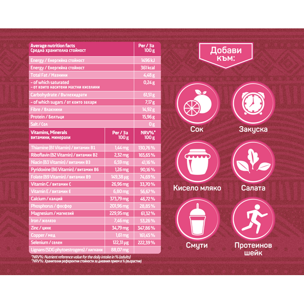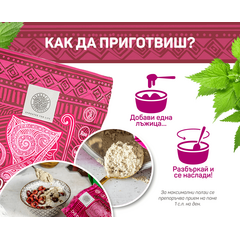 • Осигурява необходимата фолиева и силициева киселина в естествена форма, благодарение на покълналото златно просо в състава