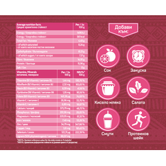 • Фитонутриенти: 6 компонента = био шипки на прах, био арония на прах, био червени боровинки на прах, био сини боровинки на прах, био екстракт от лимон, био коприва на прах