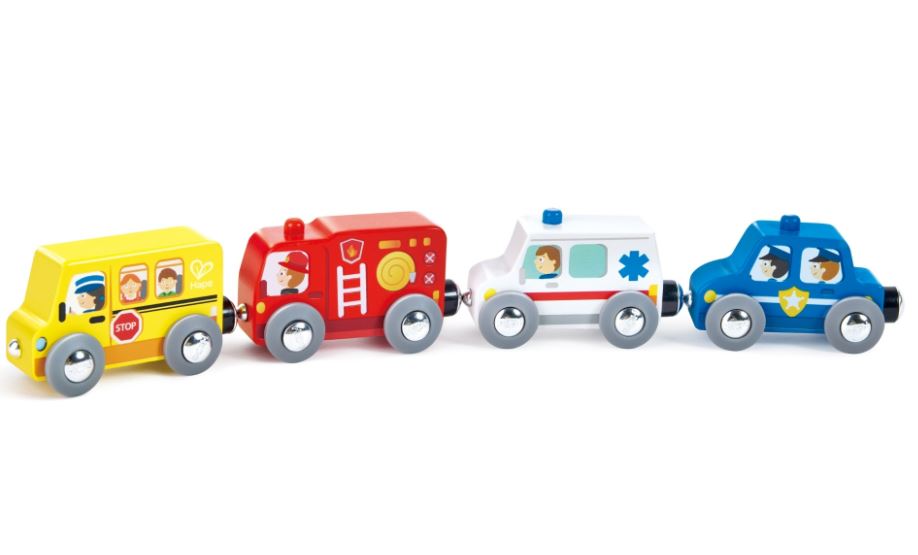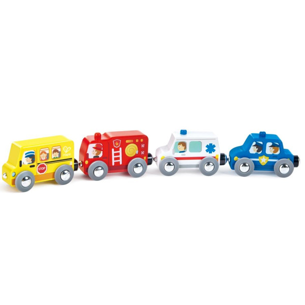 Дървен комплект, Hape, Влакче с цветни цветни превозни средства, 4 части