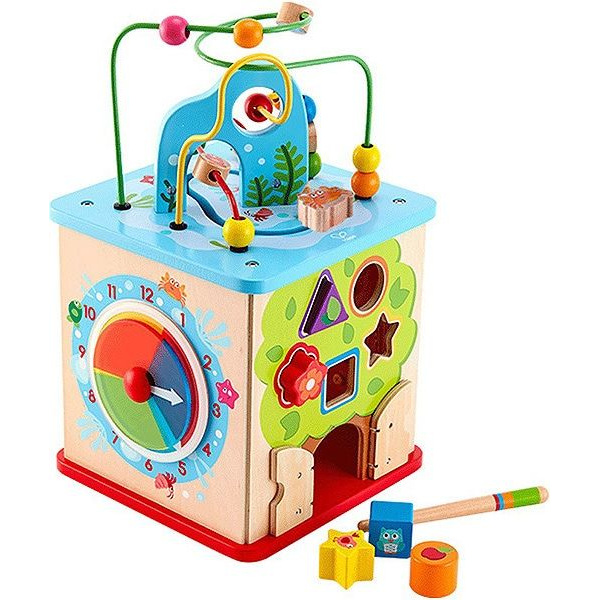 Голям дървен куб и низанка със страхотни занимания за вашето бебе! Оборудван с въртележка от дървени кубчета с животни, часовник с въртяща се стрелка, сортер с пет цветни прекрасно изризувани геометрични фигурки, ксилофон със седем цветни метални клавиша и палка и забавен лабиринт с цветни мъниста и "плуващо" раче.