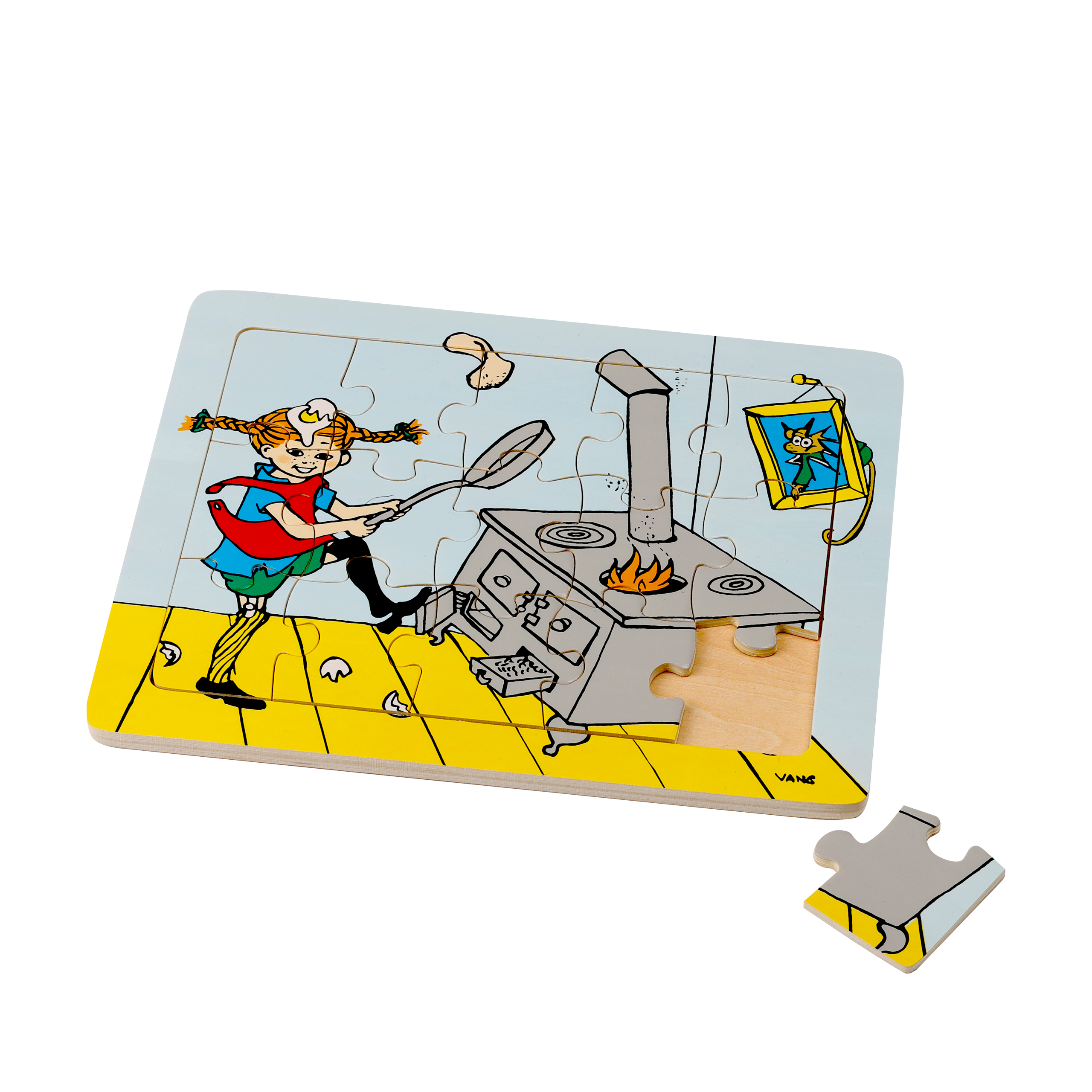 Помогнете на Пипи да обърне палачинките! В този дървен пъзел детето може да помогне на Пипи да сготви любимото си ястие: палачинки. Комплектът съдържа 15 части. Пъзелът е поставен в рамката си, което улеснява научаването къде е мястото на всяко парче. Пипи - Играйте с най-силното момиче в света! Не е чудно, че Пипи е любимката на много деца. Историите на Астрид Линдгрен за Пипи Дългото чорапче продължават да забавляват децата, а класическите илюстрации на Ингрид Ванг Найман дават на играчките игрив живот. Възраст: 3+ Материал: дърво Размери: 22х17.5х0.8 см.