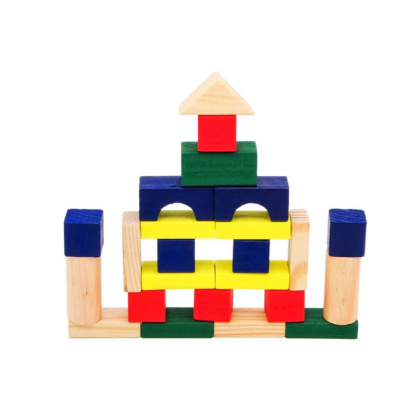 Дървени строителни кубчета с различни геометрични форми и цветове.