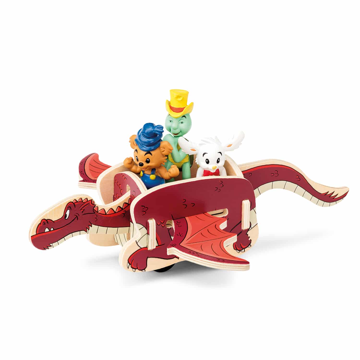 Включете се в приключенията с дракона от филма Bamse and the Thunderbell. Бамзе и приятелите му могат да скочат на гърба на дракона и да летят, където пожелаят. Драконът е направен от дърво и идва с колела, за да можете да го карате по пода, но също така се движи по класически дървени релси. Ако искате още повече време за игра с Bamse и неговите приятели, селото на Bamse и редица различни герои са налични за закупуване. FSC-сертифицирана дървесина. Съответства на изискванията на стандарта за играчки EN71 и приложимите химически разпоредби REACH и SVHC. Фигурките се закупуват отделно.