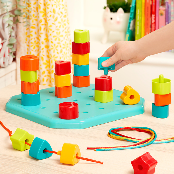 Има толкова много начини да учите и играете с тази дъска. Цветната мозайка идва в 5 различни форми - сърца, звезди, триъгълници, кръгове и квадратчета. Вашето дете може да ги сортира по цвят или форма, а след това да ги подреди високо на редица. Този комплект включва и пет корди, чрез които да нанизвате геометричните фигури. Тази игра способства за подобряване на фините двигателни умения.