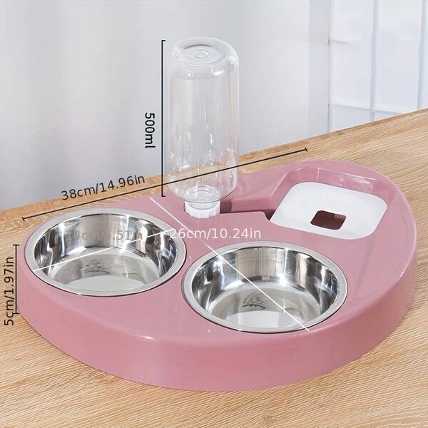 Подвижна купа за храна и вода за домашни любимци от неръждаема стомана с пластмасова стойка и пластмасова бутилка за вода.