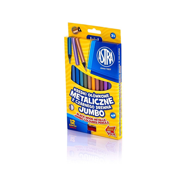 Комплект цветни моливи, Astra, Jumbo, Метални триъгълни от черна дървесина, 12 цвята с острилка