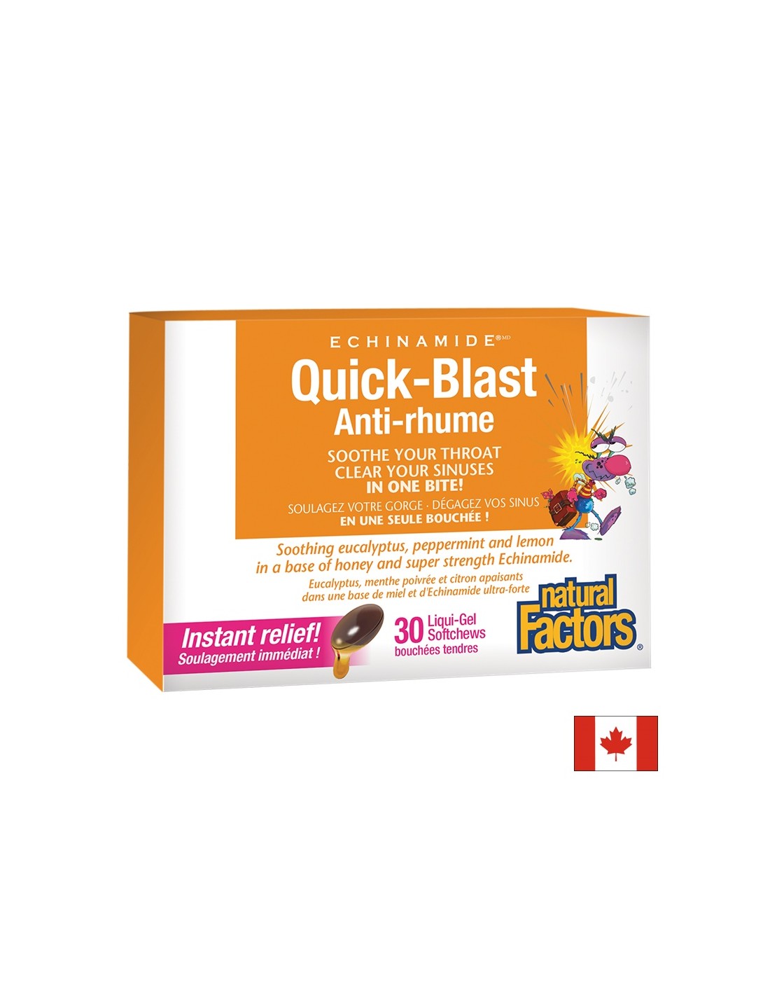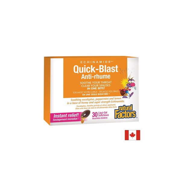 Само след една таблетка ще усетите облекчение при възпалено гърло и запушени синуси. Куик бласт комбинира мед, евкалипт, мента, лимон и ехинацея (патентован ECHINAMIDE) за облекчаване на възпаленото гърло и запушените синуси. Освен това може да се използва за облекчаване симптомите и за намаляване продължителността на инфекциите на горните дихателни пътища.
