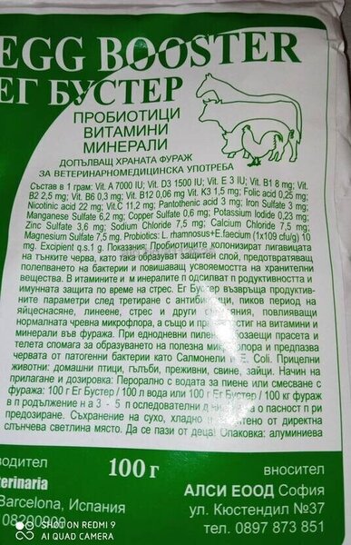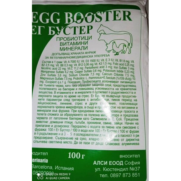 Перорално с водата за пиене или смесване с фуража: 100 г Ег Бустер - 100 литра вода или 100 кг. фураж в продължение на 3-5 последователни дни.