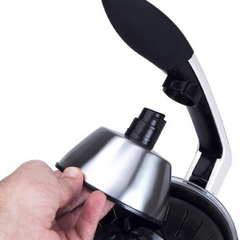 Електрическа сокоизстисквачка с удобна дръжка и кранче за директно наливане на сока в чаша.