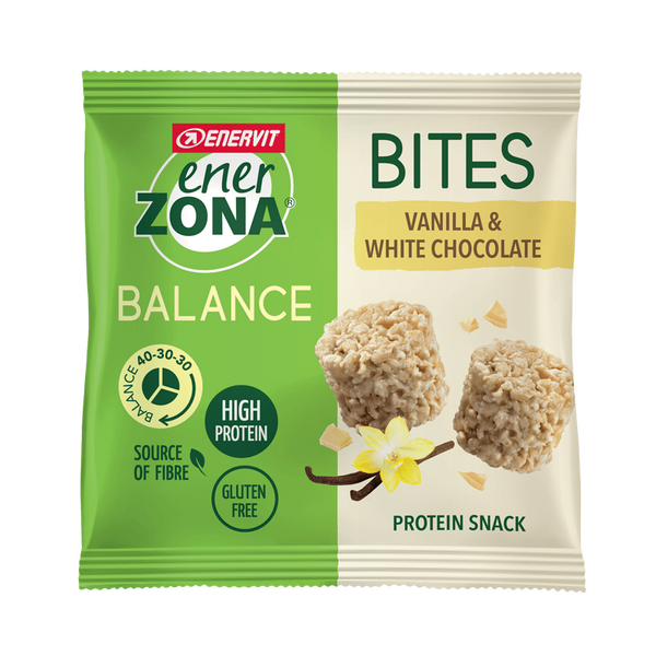 EnerZona Bites 40-30-30 Ванилия и Бял шоколад е безглутенова закуска, богата на протеин и ценен източник на фибри. Богата на протеин, с фибри Закуска по Зона Соева закуска без ГМО Без глутен Без хидрогенирани мазнини Без палмово масло EnerZona Хапки Ванилия и Бял Шоколад 40-30-30 е десерт без глутен, богат на протеини и ценен източник на фибри. Всяка хапка е балансирана в съотношение 40-30-30, за да предложи точния баланс на въглехидрати, протеини и мазнини, съчетано с удоволствието от вкуса и възможността да сте в Зоната (1 минипакет = 1 блок). Можете да ги вземете навсякъде със себе си, благодарение на практичната опаковка от единична порция (минипакет), която ги запазва винаги свежи. Добавете ги като закуска между едно или друго хранене, насладете им се докато пътувате или ги превърнете в любим десерт и завършек на вашите Зонови менюта. Опитайте ги и с млечен шоколад или черен шоколад. 40-30-30: процентно разпределение на калории на макронутриенти (въглехидрати, протеини и мазнини). НАИЧИН НА УПОТРЕБА Продуктът трябва да се използва като част от разнообразна и балансирана диета и здравословен начин на живот. СЪСТАВ Бял шоколад (57,8%) (захар, какаово масло, мляко на прах, суроватка на прах, емулгатор: соев лецитин, екстракт от ванилия) - Соеви екструзии (21%) (изолиран соев протеин, нишесте от тапиока, сол) - Концентриран соев протеин (20,5%) - Аромати - Ванилов прах Бурбонска ванилия (0,2%).