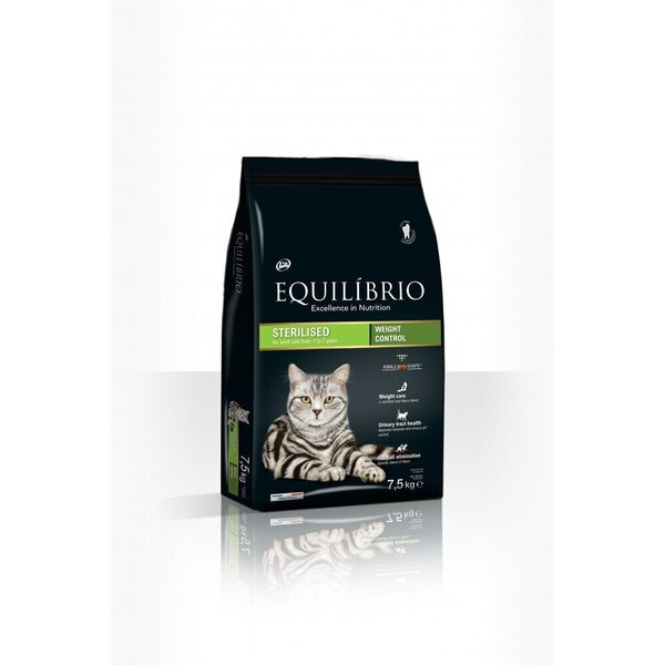 Пълноценна супер премиум храна за кастрирани котки от 1 до 7 годишна възраст. Equilibrio Sterilized за кастрирани котки или котки с наднормено тегло e формулирана с балансирани нива на протеини и мазнини, за да предостави контрол на теглото по здравословен път, като запазва всички важни хранителни вещества и страхотен вкус. Регулира оптималното тегло на котките благодарение на оптималния микс от Л-карнитин и фибри. Защитава здравето на уринарния тракт, поддържайки оптималните нива на pH. Специален бленд от фибри намалява натрупването на космени топки в храносмилателния тракт. Спомага оптималното функциониране на храносмилателна система. (FOS + MOS): FOS - стимулира развитието на полезната чревна микрофлора, това влияе положително на микробиологичния чревен баланс (бифидус ефект). MOS - улеснява елиминирането на патогенни микроорганизми от чревния тракт и подпомагат засилването на чревния имунитет Спомага за намаляването на неприятните миризми от изпражненията, благодарение на добавения екстракт от Юка. Състав: Птичи протеин, ориз, царевица, грах, пръжки, мазнина от птици, царевичен глутен, хидролизирани животински протеини, растителни влакнини, пулп от цвекло, яйчен прах, пулп от цикория (0,9% - източник на фруктоолигозахариди, ФОЗ), рибено масло, бирена мая, минерални соли, люспи от семена на живовляк, натриев хексаметафосфат (0,3%), екстракт от юка, мананолигозахариди (0,03%) Аналитичен състав: Суров протеин: 35% Сурови мазнини: 11% Сурови влакнини: 3% Сурова пепел: 7% Калций: 1,3% Фосфор: 1%  Хранителни добавки (на kg): Витамин А: 24,900 IU Витамин D3 990 IU E1 (Желязо): 90 mg E6 (Цинк): 99 mg E5 (Манган): 45 mg E4 (Мед): 12 mg E2 (Йод): 3,6 mg E8 (Селен): 0,18 mg Л-карнитин: 300 mg Стабилизатори на чревната флора: 4b1707 Enterococcus faecium: 1X10⁹ CFU Консерванти, Антиоксиданти   Инструкции за хранене Тегло на котката (кг) Препоръчителна дневна доза (гр/ден)Начин на живот ВКЪЩИ НАВЪН 2 кг 27 34 3 кг 40 50 4 кг 53 67 5 кг 67 84 6 кг 81 101 7 кг 94 117 8 кг 107 134 Това са препоръчителни количества. Порциите могат да варират в съответствие с възрастта, активността и темперамента на вашата котка. Винаги осигурявайте достъп до прясна и чиста вода. Водете котката си периодично на преглед при ветеринар. В случай, че котката ви преди това не е хранена с тази храна, препоръчваме замяната и да бъде направена постепенно, в продължение на 5-10 дни. Смесвайте старата и новата храна в пропорции 3:1; 2:1; 1:1 и обратно, докато не заместите напълно с новата храна.