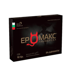 Универсал представлява висококачествена хранителна добавка за подобряване на сексуалната функция. Подходящ както за мъже, така и за жени. Продуктът оказва сексуално стимулиращо действие, спомага сексуалните функции, благоприятства възвръщането на хормоналния баланс, подобрява кръвообращението. Специалната формула на продукта съдържа растителни екстракти, благоприятстващи кръвоносните съдове в зоната на малкия таз и външните полови органи, спомагайки за доброто им кръвоснабдяване. Същевременно хранителната добавка благоприятства центровете, свързани със сексуалната възбудимост и половия рефлекс. Продуктът се препоръчва за повишаване на емоционалния тонус при близък контакт с партньора. При мъжете хранителната добавка спомага функцията на половите органи, повишава силата и времетраенето на ерекцията, засилва либидото. При дамите приемът на Еромакс Универсал благоприятства хормоналното равновесие, спомага дейността на половата система, увеличава желанието за интимност и извършване на полов акт. Хранителната добавка съдържа цветен прашец - богат източник на фитоестрогени, аминокиселини, витамини, минерали и антиоксиданти; женшен, благоприятстващ работата на нервната система; бабини зъби и магарешки трън, стимулиращи сексуалната функция и повишаващи сексуалната възбуда; клинавиче, благоприятстващо сперматогенезата при мъжете и цялостната хормонална дейност на половите органи; жъл кантарион и валериана за по-добро настроение; гинко и джинджифил за по-добро кръвоснабдяване на органите в малкия таз - включително в гениталната област; трицветна теменужка, спомагаща по-доброто храносмилане и осигуряваща важни микроелементи на организма; върбинка, благоприятстваща работата на женската полова система и спомагаща за максимална сексуална чувствителност. Освен екстракти от всички тези растения хранителната добавка съдържа и микроелемента цинк, заемащ важна роля в множество важни процеси в организма, обвързани с хормоналната дейност, имунната система, чувствителността на сетивата и поддържането на здравето и свежия вид на кожата. Активни съставки: Цветен прашец, Жълт кантарион - стрък, Жен-шен - корен, Бабини зъби - стрък, Върбинка - стрък, Трицветна теменуга - стрък, Магарешки трън - цвят, Валериана - корен, Джинджифил - коренище, Клинавиче - стрък, Гинко билоба - листа, Цинк. Производителят носи отговорност за съставките на продукта. Препоръчваме да проверите списъка със съставките на продукта директно върху опаковката поради възможни промени.