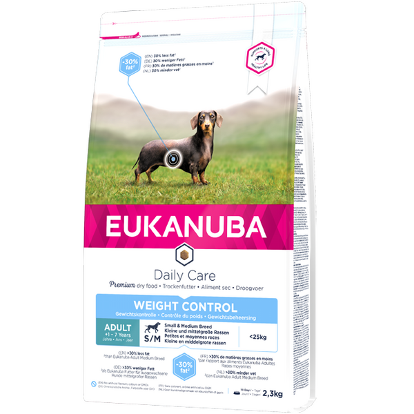 Eukanuba Daily Care Control Weight за малки и средни породи има повече от 30% по-малко мазнини (спрямо Eukanuba Adult Medium Breed), за да помогне на вашето куче да поддържа здравословно тегло.Допълнително включеният L-карнитин поддържа здравословно управление на теглото.Калцият и глюкозаминът поддържат здрави кости и стави за по-добра подвижност на на вашето куче.Тази суха храна включва също естествени източници на омега 6 и 3 за насърчаване на здрава кожа и козина.Специалната шестоъгълна форма на гранулите заедно с уникалната DentaDefense помага да се поддържат зъбите чисти и здрави.Eukanuba Daily Care weight control small and medium съдържа прясно пиле, за да поддържа слаби и силни мускули. Приспособената смес от фибри от пребиотици и цвекло от пулпа също насърчаваздравословното храносмилане. Храната е 100% пълноценна и балансирана и е идеална за възрастни кучета от малки и средни породи.