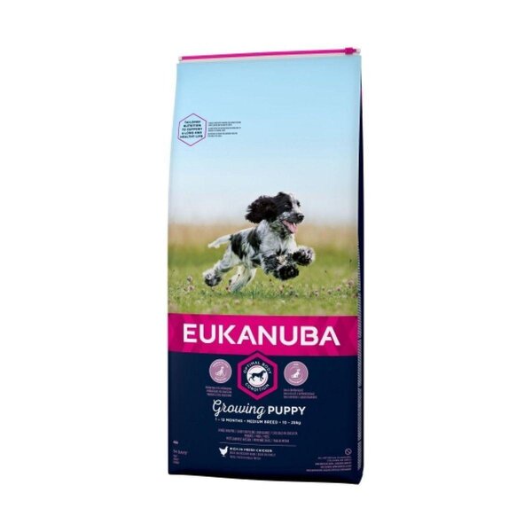 Кученцата от средните породи имат свои собствени хранителни изисквания. Тази система на Eukanuba осигурява нужните протеини, мазнини и въглехидрати, които да посрещнат тези нужди. Тя осигурява всички важни витамини и минерали необходими за оптимален растеж. Съдържа висококачествени съставки и високи нива на животински протеин, с пилешко като главен източник.   100% пълноценна и балансирана храна за кученца от средни породи, достигащи от 10 до 25 килограма в зряла възраст.   Също така подходяща за  бременни и кърмещи кучета. От 1 до 12 месеца. Богата на пилешко и пуешко.   Имунна система Поддържа имунната система и осигурява ежедневно здравословно възобновяване на здрави клетки. Съдържа важни антиоксиданти като Витамин Е.   Грижа за козината Поддържа гъста и лъскава козина,  здрава кожа и естествените лечебни процеси. Съдържа оптимален баланс на Omega-3 и Omega-6 мастни киселини.   Грижа за храносмилателната система Поддържа здрав храносмилателния тракт и ефективно усвояване на хранителните вещества. Съдържа умерени фибри (цвекло).   Баланс на глюкозата Помага поддържане на нормално ниво на кръвната захар след хранене. Page 1 Product 148, 25 October 2007 Съдържа специални източници на въглехидрати   Витамини Гарантирани нива на витамините до края на срока на годност Умните кученца имат DHA За умни, трениращи кученца формулирана с оптимални нива на DHA, ключов нутриент изграждащ мозъка, поддържа оптимално слуха, зрението и мозъчната функция. Базирана на новаторски  проучвания на кученца и техните майки, яли Eukanuba.   Състав: Сушено пилешко и пуешко (> 28%), царевица, пшеница, животинска мазнина, сушено цвекло (> 2,5%), смляно пилешко, ориз, сушени цели яйца, рибно масло, сушена бирена мая, калиев хлорид, натриев хлорид, фруктоолигозахариди (0,15%), екстракт от невен   Анализ: Протеини: 29.0%, Мазнини: 18.0%, Омега-6 мастни киселини: 2,70%, Омега-3 мастни киселини: 0,45% DHA: 0.10%, влага: 8,00%, сурова пепел: 6.67%, Сурови влакна: 2.50% , калций: 1,18%, Фосфор: 0.91%.   Добавки: Витамини: Витамин А: 15,000 IU / кг, Витамин D3: 750IU/kg, витамин Е (α-токоферол): 200mg/kg, β-каротин: 1 mg / kg.   Микроелементи: Железен железен сулфат, хептахидрат: 234mg/kg, цинк като цинков оксид: 195mg/kg, манган, както манганов оксид: 26mg/kg, манган, както Манганов сулфат, монохидрат: 19mg/kg, мед като меден сулфат, пентахидрат: 15mg/kg , йод, като калиев йодид: 3 mg / kg, кобалт, както Basic Cobaltous карбонат, монохидрат: 0,5 mg / kg.   Хранене на кучето:   Когато започвате да храните за пръв път с Eukanuba, ние препоръчваме въвеждането на храната да става постепенно, за минимум 4 дни. Препоръчваме хранене на кучето по 2-3 пъти на ден. Разделете дневната дажба, която е показана на диаграмата на броя на храненията. Eukanuba Puppy&Junior Medium Breed може да бъде използвана в перида на отбиване 3-6 седмици. Накисвайте гранулите за периода на отбиване. Кучето ви може да яде повече или по-малко, в зависимост от възрастта си, темперамента и нивото на активност.   Винаги трябва да има достатъчно пряснa вода за кучето.