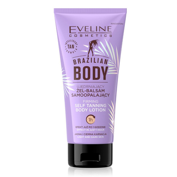 EVELINE BRAZILIAN BODY SELF-TANNING СТЯГАЩ ЛОСИОН ЗА ТЯЛО СТЯГАЩИЯ ГЕЛ-ЛОСИОН осигурява дълготраен, красив и естествено изглеждащ тен, видим само за 1 час след нанасянето. Advanced InteligentTanFormula™ прави цвета да се развива с течение на времето и да съответства на тена, като по този начин създава перфектен бразилски тен – без ивици, без петна, без нежелани тонове