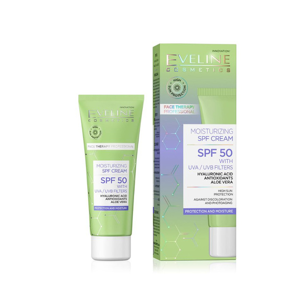 EVELINE СЛЪНЦЕЗАЩИТЕН КРЕМ ЗА ЛИЦЕ SPF 50 С АЛОЕ ВЕРА Ежедневното излагане на слънце изсушава кожата, ускорява процесите на стареене и образуване на бръчки, както и влияе върху появата на обезцветяване. За това кремът с висок фактор се препоръчва за всеки, независимо от типа кожа. Също така се препоръчва за употреба по време на концентрирани лечения с ретинол и киселини