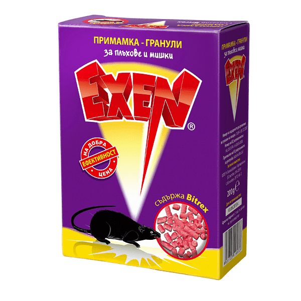 Предназначение:Родентицид за гарантирано бързо и пълно унищожаване на мишките и плъховете в градината и в дома. Гранулата съдържа горчиво вещество, което предотвратява случайна консумация от хора и домашни любимци.Категория на потребителите:Масова, професионална и професионалистиНомер на издаденото разрешение за пускане на пазара:1616-4/28.08.2020 г.Начин на употреба:Родентицидът се поставя в дератизационни кутии, защитени срещу отваряне и обезопасени по начин, който свежда до минимум риска от случайно поглъщане на препарата от деца и нецелеви животни. Примамките се фиксират вътре в кутията, за да не бъдат измъквани и разпилявани от гризачите. Кутиите с примамка се поставят в засегнатите от гризачи зони и помещения, близо до дупките им, по маршрутите им на движение и местата, които основно предпочитат. Заложените примамки трябва да се проверят на 2-рия – 3-тия ден (за мишки) и на 5-тия -7-мия ден (за плъхове) след началото на третирането и поне веднъж седмично след това, за да се провери дали се приемат от гризачите и да се презареждат, ако са изядени или повредени (замърсени или намокрени). Това продължава докато консумацията спре. Съдържание: 150 гр. (3 сашета по 50 гр.)