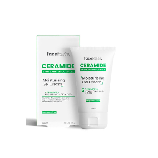 FACE FACTS ХИДРАТИРАЩ КРЕМ - ГЕЛ ЗА ЛИЦЕ СЪС СЕРАМИДИБъдете нежни към кожата си с нашия лек хидратиращ крем Ceramide, идеален за чувствителна кожа. Формулиран с нашия бариерен комплекс на кожата от 5 серамиди, заключваща влагата хиалуронова киселина, глицерин, витамин Е и успокояващ кожата овес, той помага за успокояване и укрепване на кожната бариера, за да се предотврати загубата на влага. Дайте на кожата си допълнителната грижа, която заслужава!