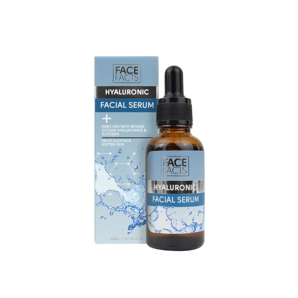 FACE FACTS ХИДРАТИРАЩ СЕРУМ ЗА ЛИЦЕ ХИАЛУРОНОВА КИСЕЛИНАХидратирайте кожата с хиалуроновия серум за лице Face Facts. Обогатен с бетаин, натриев хиалуронат и глицерин, този серум помага да се намали появата на фини линии и бръчки, като същевременно оставя кожата мека и еластична. Перфектната подготовка на кожата преди нанасяне на грим за максимален блясък. Формулиран без парабени.