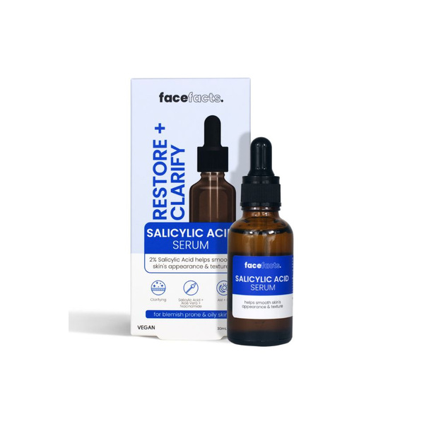 FACE FACTS ВЪЗСТАНОВЯВАЩ СЕРУМ ЗА ЛИЦЕ САЛИЦИЛОВА КИСЕЛИНАВъзстановете и изчистете кожата си с нашия серум за лице със салицилова киселина. Снабден с 2% салицилова киселина, успокояващо алое вера и ниацинамид, нашият серум нежно премахва повърхностните примеси и помага за намаляване на появата на петна.