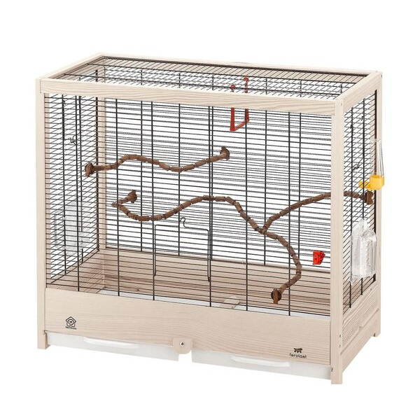 Оброрудвана с вадещи се хранилки, поилка, щипка за храна, гъвкави пластмасови модулни кацалки, позволяващи различни форми.