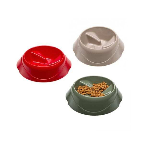 Пластмасови купи за храна със специален дизайн спомагащ за по-бавно хранене. Оригиналната вътрешна структура забавя поглъщането на храна и насърчава по-бавното хранене и внимателно дъвчене. Това спомага за по-бързото задоволяване на апетита на кучето и регулира наднорменото тегло. Здрави и устойчиви, изработени от изключително плътна пластмаса. С протипоплъзгащи крачета. Лесни за почистване.