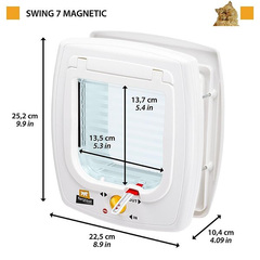 Всички по-големи врати се предлагат с удължител от 5 cm, позволяващ да се адаптират към всички структури и могат да се подкъсяват (само удължителите към Swing 7 и Swing Microchip не бива да се режат, тъй като съдържат много деликатен механизъм.Налични цветове: бял, кафяв.Размери (цялата вратичка ): 22,5 x 10,4 x h 25,2 cmРазмери (място за минаване на животното): 13,5 x h 13,7 cm