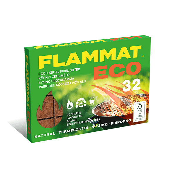 Екологични разпалки за барбекю. Flammat ECO разпалка е натурално разпалващо средство от дървен материал и парафин. Не предизвиква димене, нито специфична миризма. Пали дърво, брикети, въглища и дървени въглища.