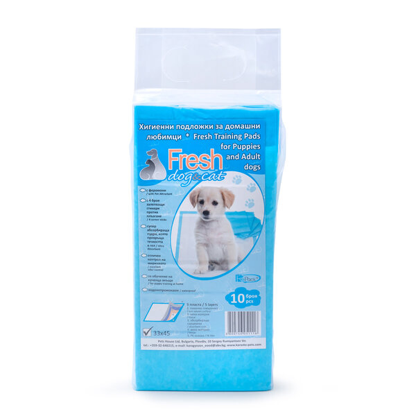 Fresh Хигиенни подложки с ФЕРОМОНИ И СТИКЕРИ се предлагат в опаковка от 10 броя. Специалните феромони привличат кучето и то се изхожда на правилното място.