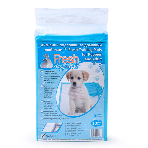 Fresh Хигиенни подложки с ФЕРОМОНИ И СТИКЕРИ се предлагат в опаковка от 10 броя. Специалните феромони привличат кучето и то се изхожда на правилното място.