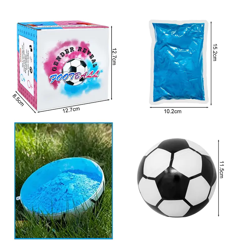 При удар с крак, топката ще излети и ще се разтвори, ракривайки цветен прах съответстващ пола на детето.
