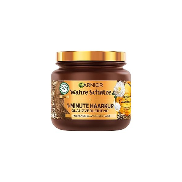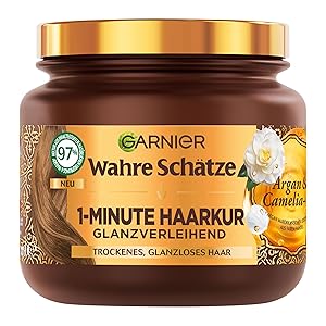 Garnier Wahre Schätze 1 Minute Маска за Коса с Арган и Камелия 340 мл Бързодействаща подхранваща маска за суха и изтощена коса Wahre Schätze 1 Minute Hair Treatment е интензивна маска за коса с бързо действие, създадена за суха, изтощена и безжизнена коса. Само за 1 минута подхранва и възстановява косъма в дълбочина. Формулата с арганово и камелиево масло придава мекота, блясък и гладкост, без да утежнява косата. Активни съставки и действие: Арганово масло; подхранва и възстановява косъма Камелиево масло омекотява и изглажда косата< Без силикони; не утежнява косата Ползи: Възстановява суха и увредена коса Придава блясък и мекота Бързо действие – само 1 минута
