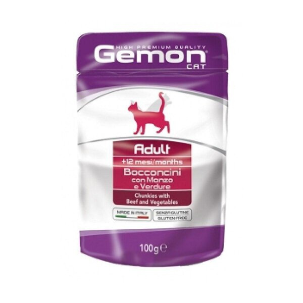 Пауч хапки за котки в зряла възраст с говеждо и зеленчуци – пълноценна храна за котки на възраст над 1 година. Формула с прясно месо с отличен вкус. Без глутен.