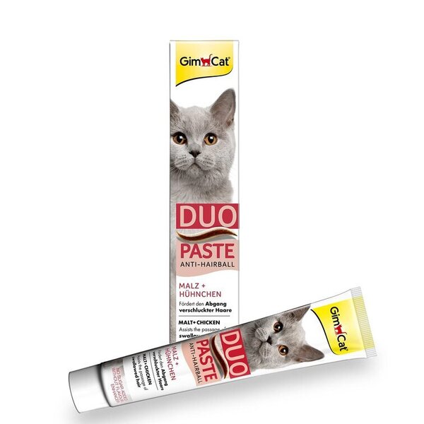 С GimCat Anti-Hairball Duo-Paste Malt & Chicken получавате допълнителна храна, специално разработена за насърчаване на естественото отделяне на погълнатата козина .Пастата против образуване на косми съдържа подбрани съставки като малц , масла и фибри , които улесняват преминаването през храносмилателния тракт. Освен това продуктът е приготвен с пилешко месо, което допринася за превъзходен вкус и по този начин допринася за висока приемливост.