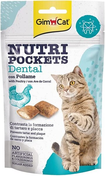 Допълваща храна за котки - хрупкави хапки с вкусен пълнеж. Почистващите частици, съставени от целулоза, осигуряват механична абразия на плаката и спомагат за намаляване на повторното й натрупване.