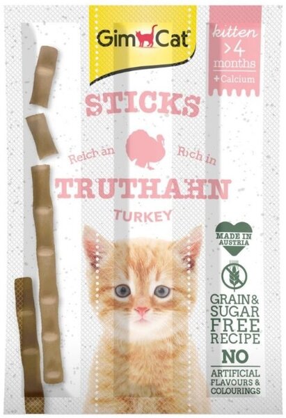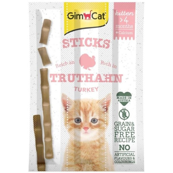 Саламените пръчици за коте GimCat Kitten Sticks имат високо месно съдържание и съдържат много калций. Калцият е важен за развитието на костите, мускулите и зъбите. GimCat Kitten Sticks са идеалното лакомство за дъвчене и похапване между основните хранения.