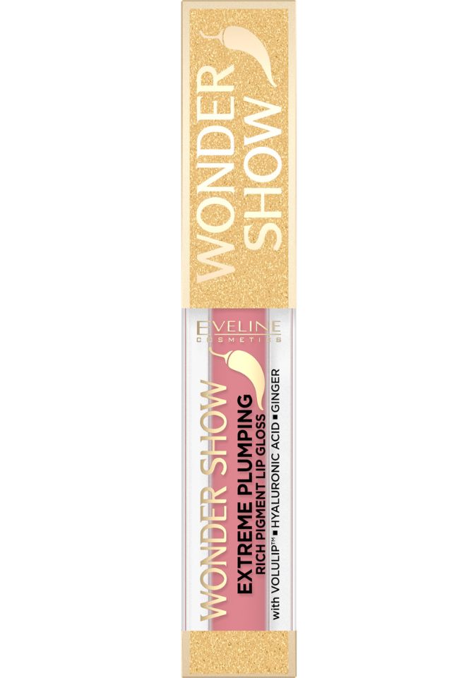 EVELINE WONDER SHOW EXTREME ГЛАНЦ ЗА УСТНИ. Кремообразният, ултра лъскав гланц за устни фино подчертава формата на устните, придавайки им чувствен, примамлив вид. Формулата за грижа за устните, съдържаща хиалуронова киселина, ексракт от джинджифил и съставка за изпълване на устните VOLULIP, осигурява интензивна и дълготрайна хидратация. Благодарение на усъвършенствания състав, ефектът на по-пълните устни е видим още след първото нанасяне.