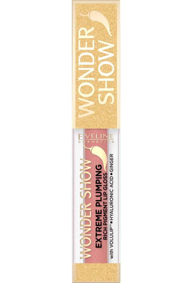 EVELINE WONDER SHOW EXTREME ГЛАНЦ ЗА УСТНИ. Кремообразният, ултра лъскав гланц за устни фино подчертава формата на устните, придавайки им чувствен, примамлив вид. Формулата за грижа за устните, съдържаща хиалуронова киселина, ексракт от джинджифил и съставка за изпълване на устните VOLULIP, осигурява интензивна и дълготрайна хидратация. Благодарение на усъвършенствания състав, ефектът на по-пълните устни е видим още след първото нанасяне.