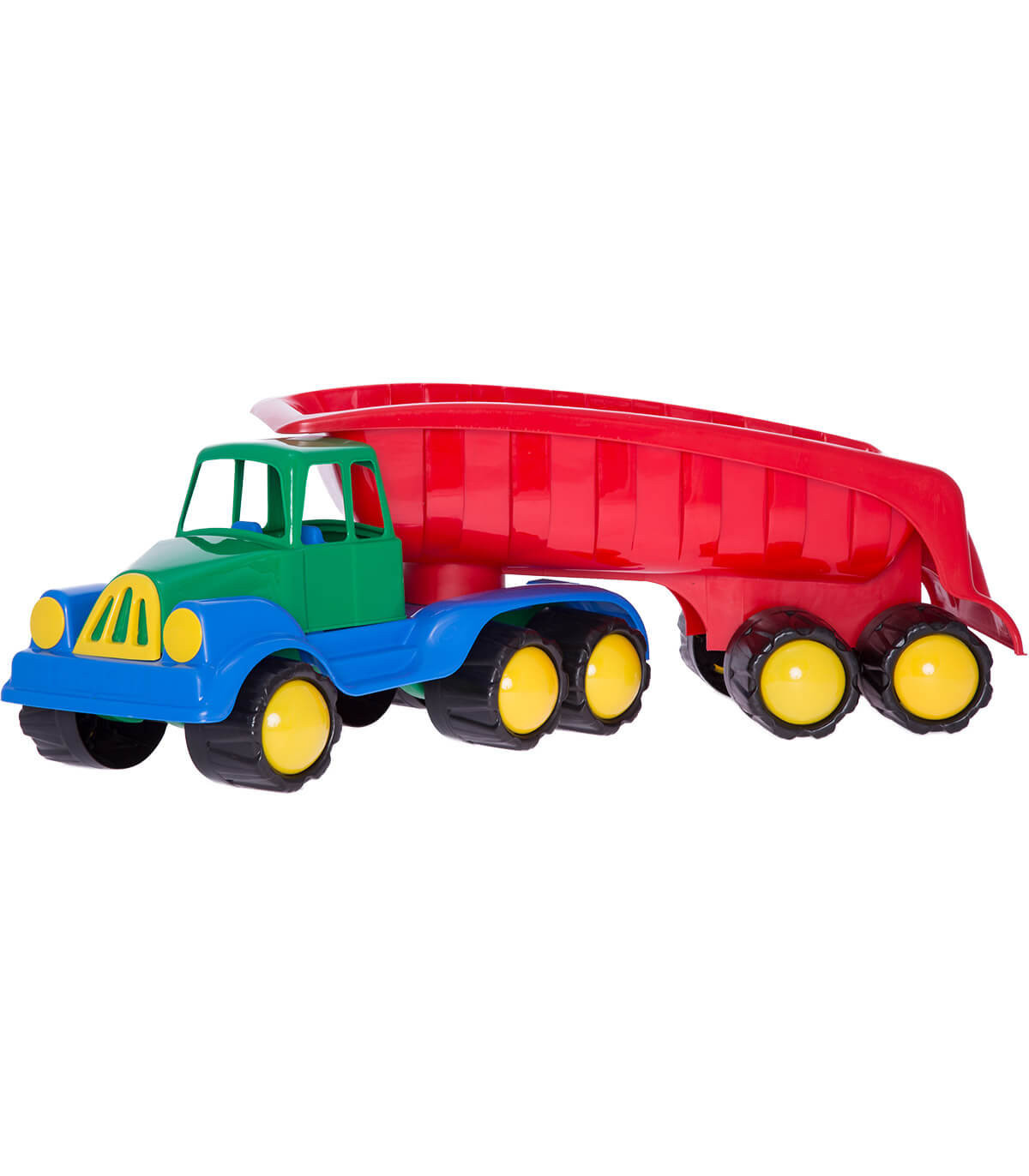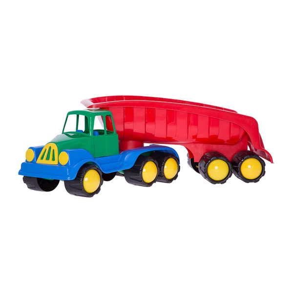 Камион самосвал с голямо въртящо се ремарке, подходящ за игри вкъщи, в парка или дори плажа. Ремаркето е наистина голямо, за да може спокойно да побере и транспортира най-важните ви съкровища. Благодарение на масивните си колела, цели 10 на брой, камионът ще се движи с лекота по всякакъв вид пътна настилка. А здравата пластмаса, от която е изработен, е устойчива на интензивна употреба, за да се забавлявате без притеснения за целостта на играчката!