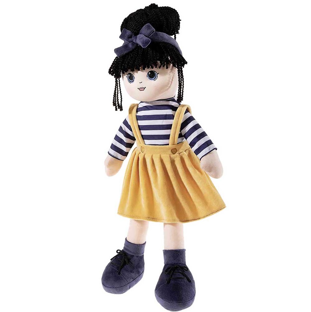 С ясните си сини очи и черна коса, закопчена със синя лента за глава, нашата кукла Poupetta Мила превзема детските сърца веднага. Облечена в стилна комбинация от жълта пола и синя и бяла риза на райета, можете да започнете да се гушкате веднага. Тя е изработена от мек пълнеж, а косата й е от вълна. Поради нейния размер от 63 см. и висящите си ръце и крака, тя е не само страхотна XL кукла, но и XL най-добра приятелка и партньор за гушкане.