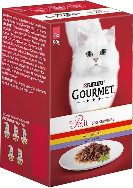 GOURMET MON PETIT е гама от изискани рецепти, специално разработени, за да позволят на котката Ви да се наслади на голямо разнообразие от вкусове в правилния размер от 50g.