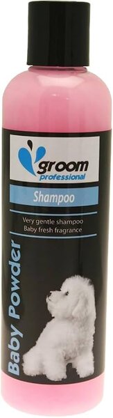 Groom Professional Baby Powder Shampoo е професионален шампоан, който дълбоко почиства и оставя козината свежа, мека и ароматна. С класическия си аромат на бебешка пудра е любим избор за груминг салони и домашни стопани. Подходящ за кучета и котки от всички породи.