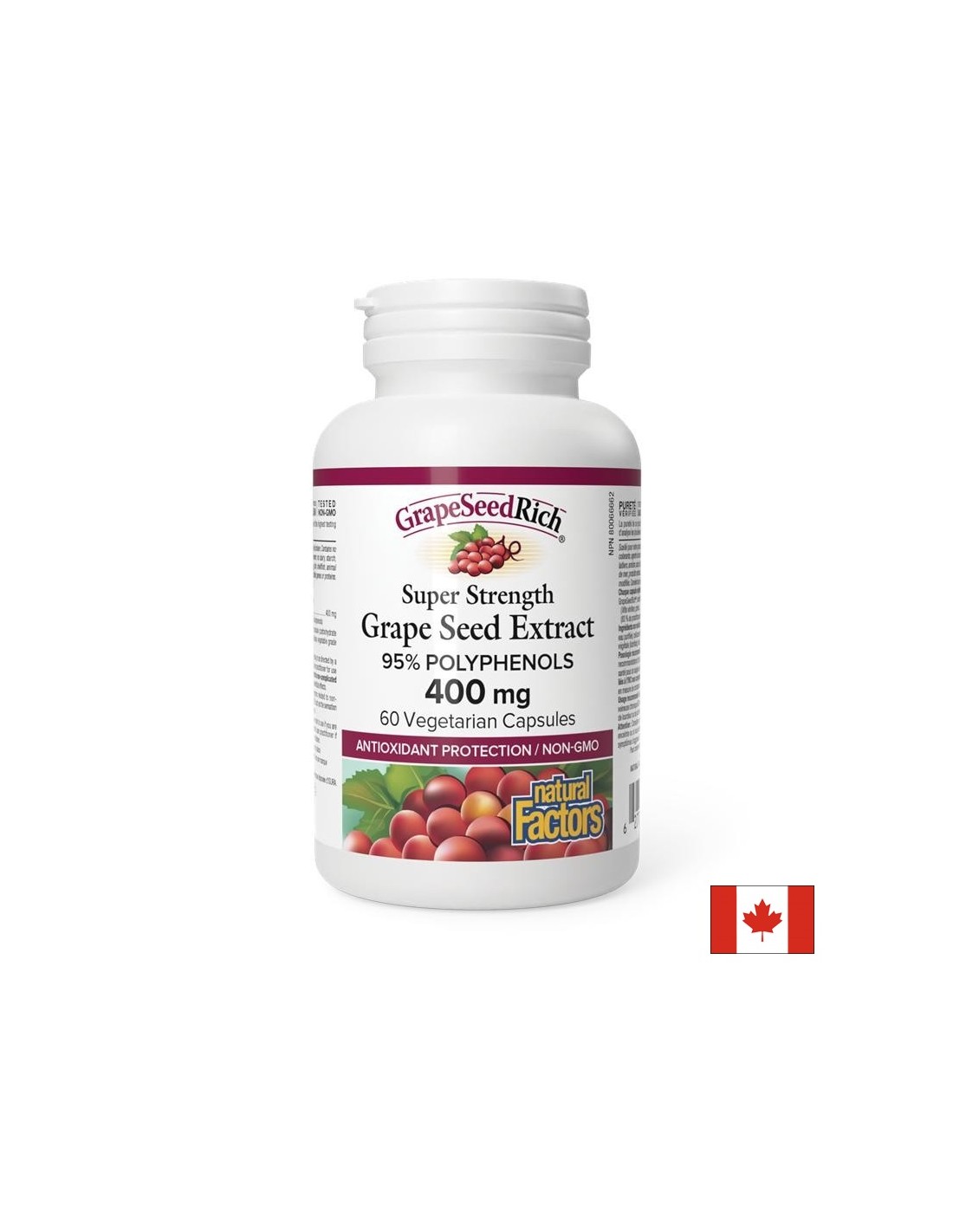 Гроздово семе 400 mg на Natural Factors съдържа стандартизиран екстракт от гроздово семе GrapeSeedRich с по-висока ефикасност, 100:1, гарантирано съдържащ 95% полифеноли и 80% олигомерни проантоцианидини. Той е източник на антиоксиданти и спомага за облекчаване на симптомите на хронична венозна недостатъчност (ХВН), като усещане за подуване, тежест и мравучкане в краката. В рандомизирано, контролирано клинично проучване пациенти, които са приемали 400 mg екстракт от гроздови семена дневно в продължение на 3 месеца, се наблюдава до 50% намаляване на проблемите с вените на долните крайници.