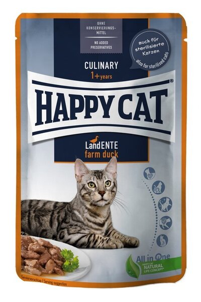 Несъдържащата зърнени продукти рецепта на Happy Cat Culinary Adult Farm Duck е лесносмилаема и подходяща също за чувствителни котки.