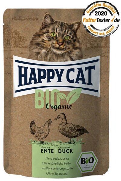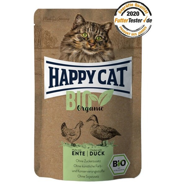 Happy Cat All Meat Organic Chicken & Organic Turkey, с висококачествено месо от сертифицирани биологични ферми, означава истинско удоволствие за котките. Вкусната органична храна за глезене на възрастни котенца..