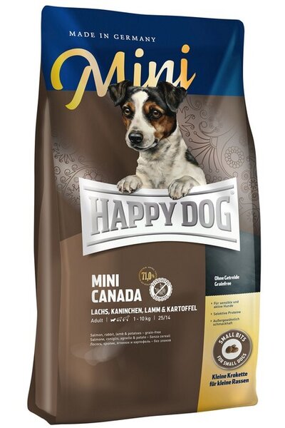 Диета без зърнени храни е най-добрият избор за чувствителни кучета. Happy Dog Mini Канада е разработен специално за активни възрастни кучета от дребни породи. Също така е идеален за чувствителни млади кучета от дребни породи от 8 месеца. Изключително вкусна супер премиум пълноценна храна Mini Канада се приготвя с най-качествено месо от сьомга, вкусен заек и агне плюс безглутенови картофи. Усъвършенствахме тази изключителна рецепта с уникалния Happy Dog Life Natural Concept® от натурални съставки.